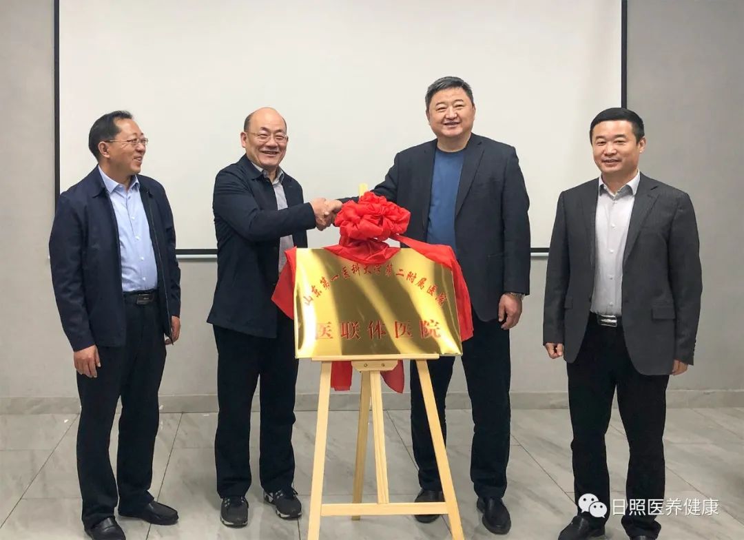 仪式最后,由日照市卫生健康委员会二级调研员佘华亮主任、日照市东港区卫生健康局党组成员、副局长胡杰和山东第一医科大学骨科研究所所长张辉同日照医养医院管理委员会宋洪伟主任共同揭牌,标志着医联体正式成立。