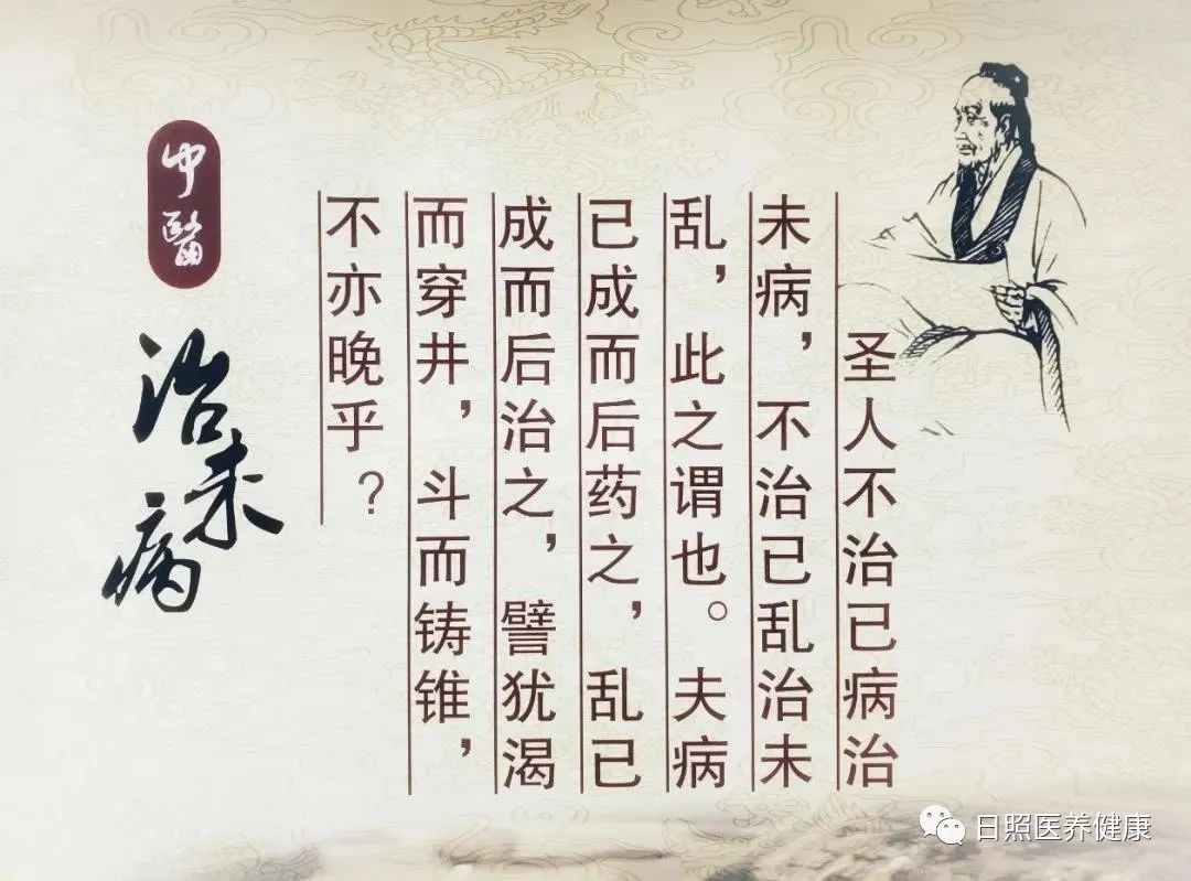 早在《黄帝内经》中就提出来“不治已病治未病”的防病养生谋略,是至今为止我国卫生界所遵循的“预防为主”战略的最早思想,通过饮食起居、情志调理、运动疗法、中草药、经络调理等各种中医传统疗法,调养体质,调理身体阴阳气血平衡,增强人体抗病能力。